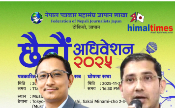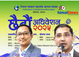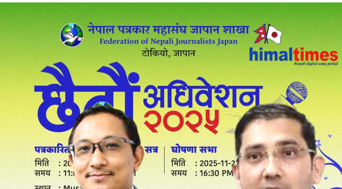 टोकियो । नेपाल पत्रकार महासंघ जापान शाखाको छैटौँ अधिवेशनको नोभेम्बर २३ मा टोकियोमा हुदै छ । अधिवेशनबाट आगामी ३ वर्षे कार्यकालका लागि नयाँ समिति...
