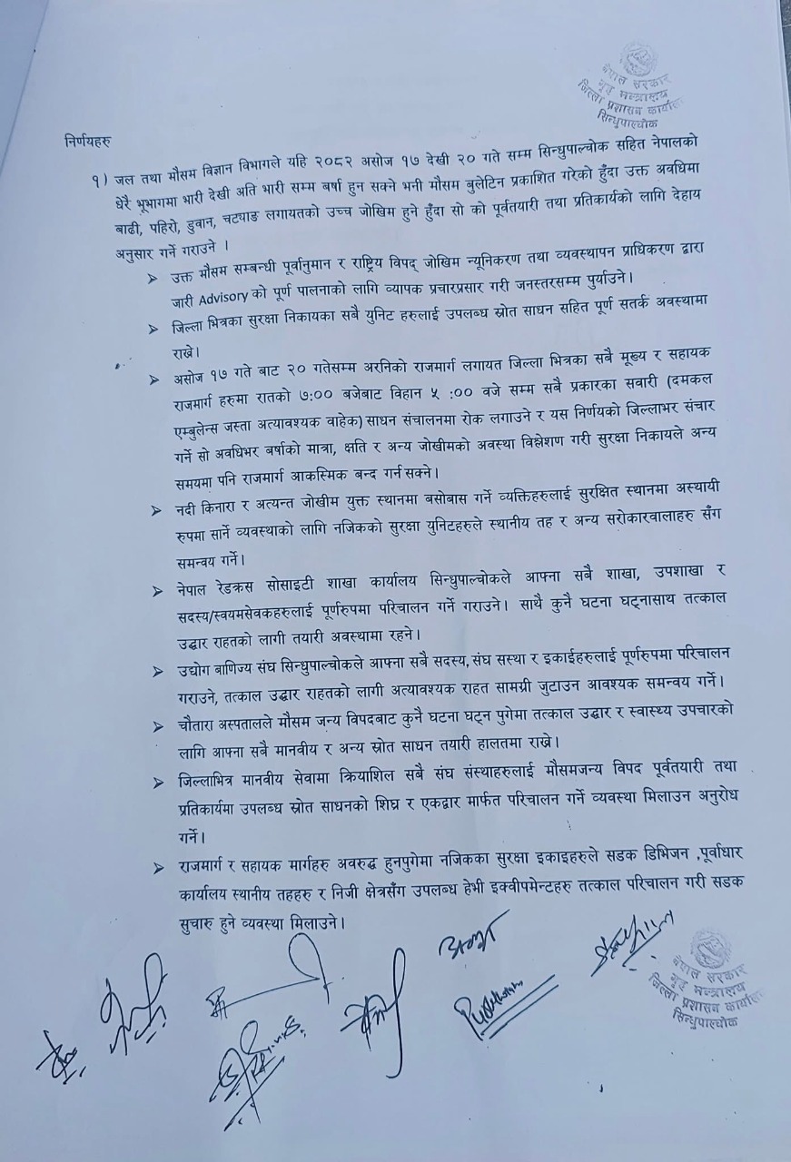 रामेछाप । जल तथा मौसम विज्ञान विभागले असोज १७ देखि २० गतेसम्म नेपालका विभिन्न भूभागमा भारीदेखि अति भारी वर्षा हुने पूर्वानुमान गरेपछि जिल्ला प्रशासन कार्यालय सिन्धुपाल्चोकले उच्च सतर्कता अपनाउने निर्णय गरेको छ ।