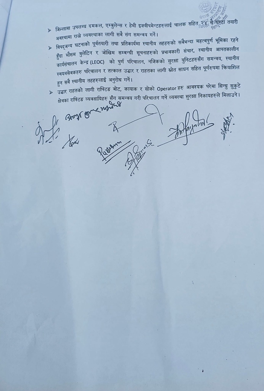 यस्तै, जरुरी परेमा उद्धारका लागि सिन्धु–सुकुटे क्षेत्रमा रहेका राफ्टिङ व्यवसायीहरूको बोट, कायाक र तिनका चालकसमेत सुरक्षा निकायसँग समन्वय गरी परिचालन गर्ने व्यवस्था मिलाइने भएको छ ।