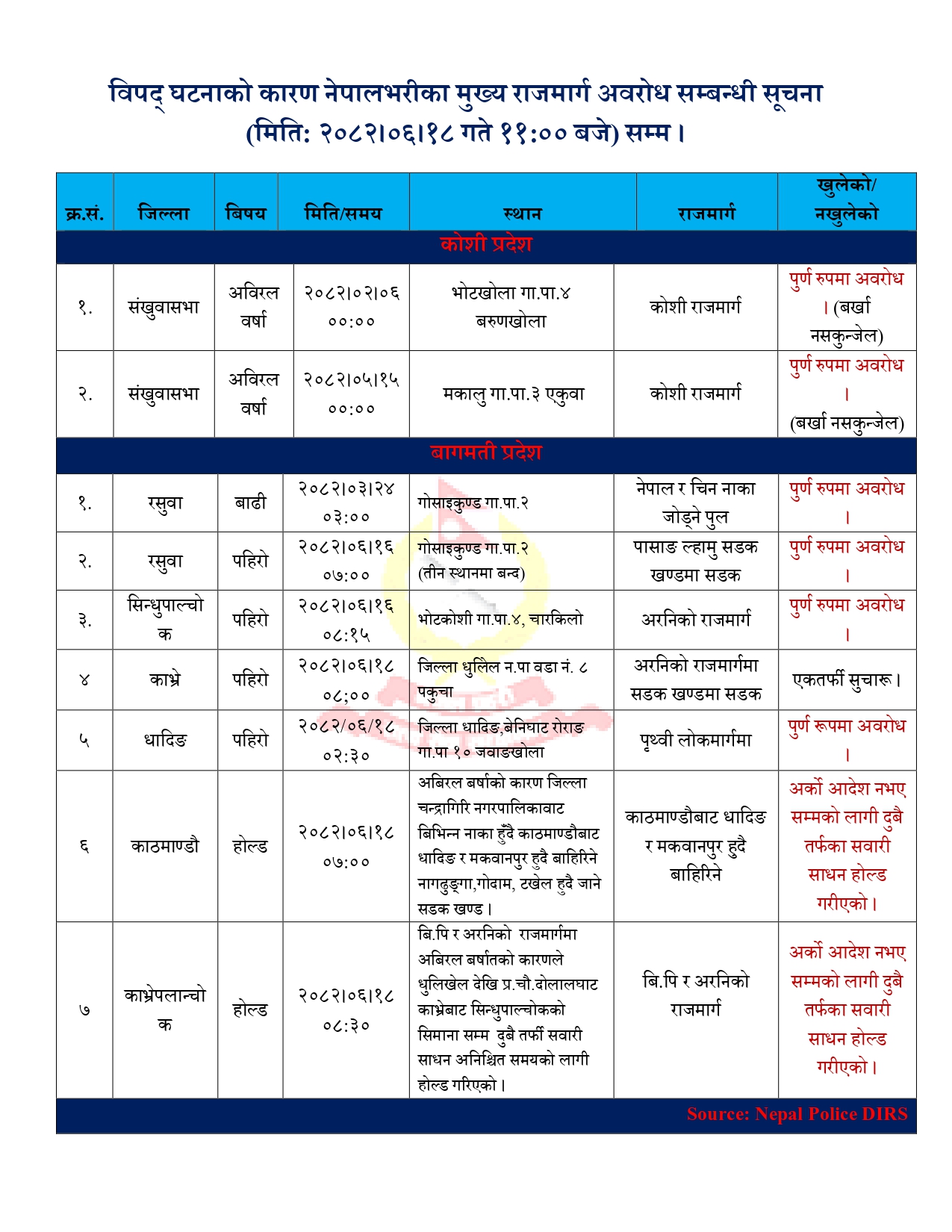 नेपाल प्रहरीको विपद् सूचना व्यवस्थापन प्रणाली (म्क्ष्च्क्) अनुसार बिहान ११ बजेसम्म विभिन्न जिल्लामा राजमार्गहरू पूर्णरूपमा अवरुद्ध भएका छन् भने केही स्थानमा एकतर्फी सञ्चालन भइरहेका छन् ।