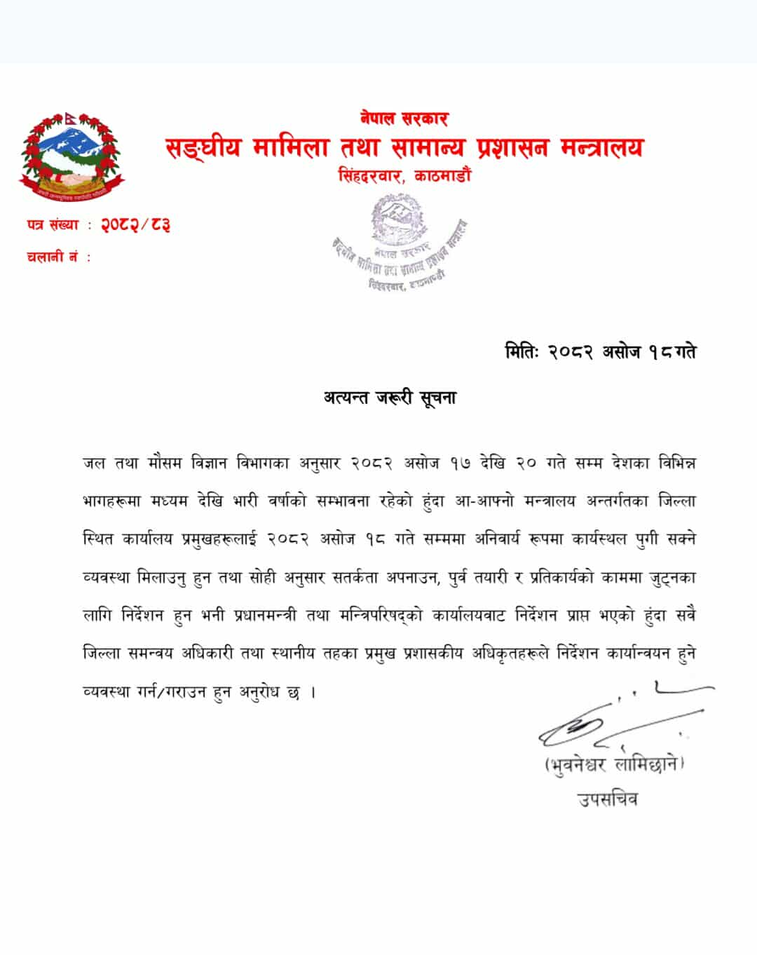 काठमाडौं । जल तथा मौसम विज्ञान विभागले असोज १७ देखि २० गतेसम्म देशका विभिन्न भागहरूमा मध्यमदेखि भारी वर्षा हुने पूर्वानुमान गरेपछि सङ्घीय मामिला तथा सामान्य प्रशासन मन्त्रालयले जिल्लास्तरीय कार्यालय प्रमुखहरूलाई कार्यस्थलमा अनिवार्य रूपमा उपस्थित हुन निर्देशन दिएको छ ।