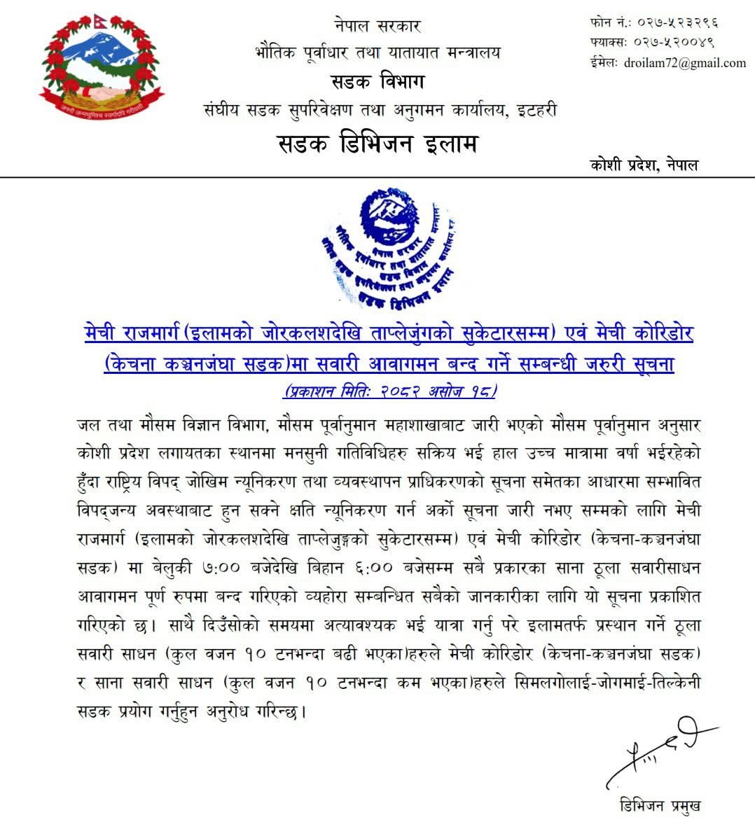 जस अन्तर्गत इलामको जोरकलशदेखि ताप्लेजुङ्गको सुकेटारसम्म एवं मेची कोरिडोर केचना–कञ्चनजंघा सडक मा बेलुकी ७ः०० बजेदेखि बिहान ६ः०० बजेसम्म सबै प्रकारका साना ठूला सवारीसाधन आवागमन पूर्ण रुपमा बन्द गरिएको व्यहोरा सूचनामा उल्लेख छ ।