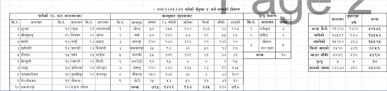नभागेका कुल कैदी १५ हजार ५ सय २५ छन् भने त्यसमा कारागारका १५ हजार १ सय ६२ छन् भने सुधारगृहबाट ६ सय ६३ जना छन् । यसका साथै भागेका मध्ये कुल ८ हजार ८ सय ५१ जना कैदी फिर्ता आएका छन् । त्यसमा कारागारका ८ हजार ५ सय १० छन् भने सुधारगृहका ३ सय ४१ जना रहेका छन् ।