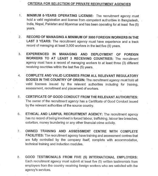 मलेसियाको परराष्ट्र मन्त्रालयले क्वालालम्पुरस्थित नेपाली दूतावासलाई पत्राचारमार्फत जानकारी गराएको छ, जसअनुसार ती मापदण्ड पूरा गर्ने कम्पनीबाट पठाइएका कामदार मात्रै लिन सकिनेछ।