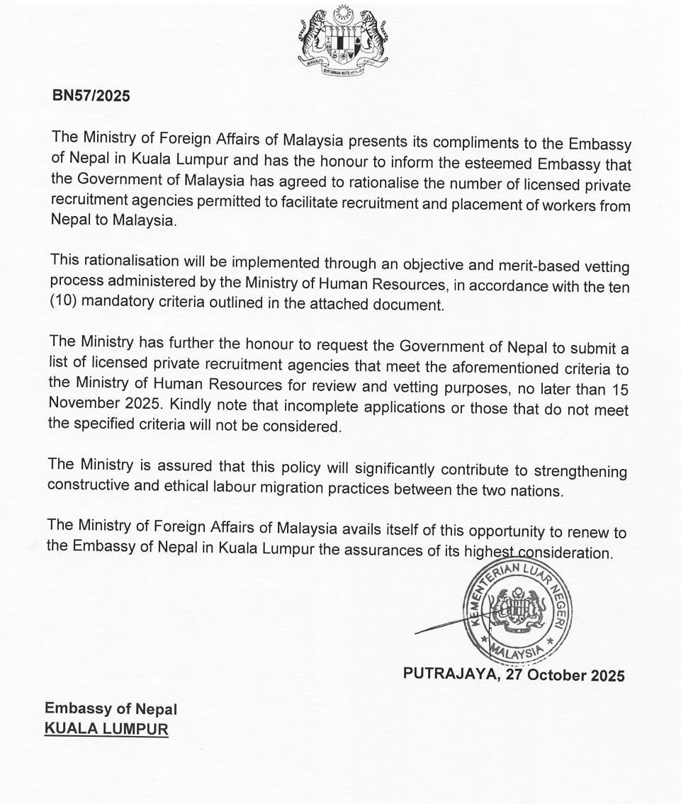 मलेसियाको पत्रमा भनिएको छ, “नेपाल सरकारले तोकिएका मापदण्ड पूरा गर्ने वैदेशिक रोजगार एजेन्सीहरूको सूची १५ नोभेम्बर २०२५ भित्र पठाइदिनुहोस्। अधुरा वा मापदण्ड अपूरा आवेदन विचार गरिने छैन।”