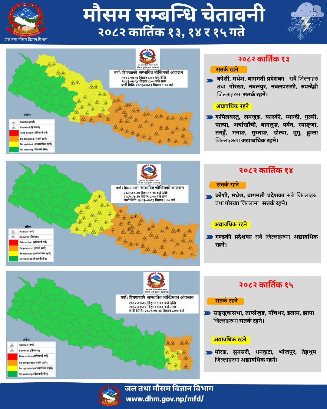 काठमाडौं। जल तथा मौसम विज्ञान विभागको मौसम पूर्वानुमान महाशाखाले आगामी तीन दिन (२०८२ कार्तिक १३, १४ र १५ गते) का लागि देशभर वर्षा र हिमपातको सम्भावना रहेको भन्दै मौसमसम्बन्धी चेतावनी जारी गरेको छ।