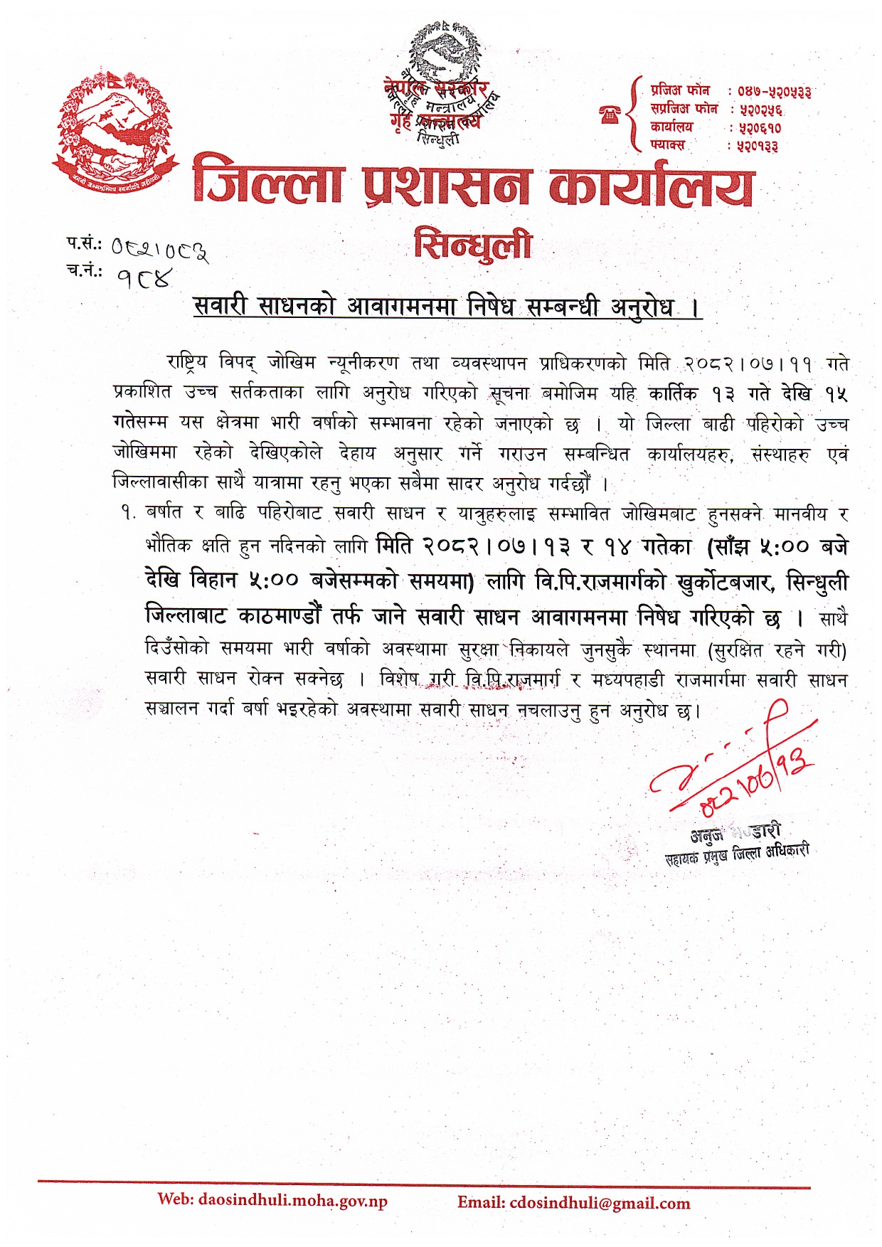 सिन्धुली जिल्ला प्रशासन कार्यालयले कार्तिक १३ गते साँझ ५ बजे देखि कार्तिक १४ गते बिहान ५ बजे, र कार्तिक १४ गते साँझ ५ बजे देखि कार्तिक १५ गते बिहान ५ बजे सम्म विपी राजमार्गको खुर्कोट बजारबाट काठमाडौंतर्फ जाने सवारी साधनहरूको आवागमनमा निषेध गरेको जनाएको छ।