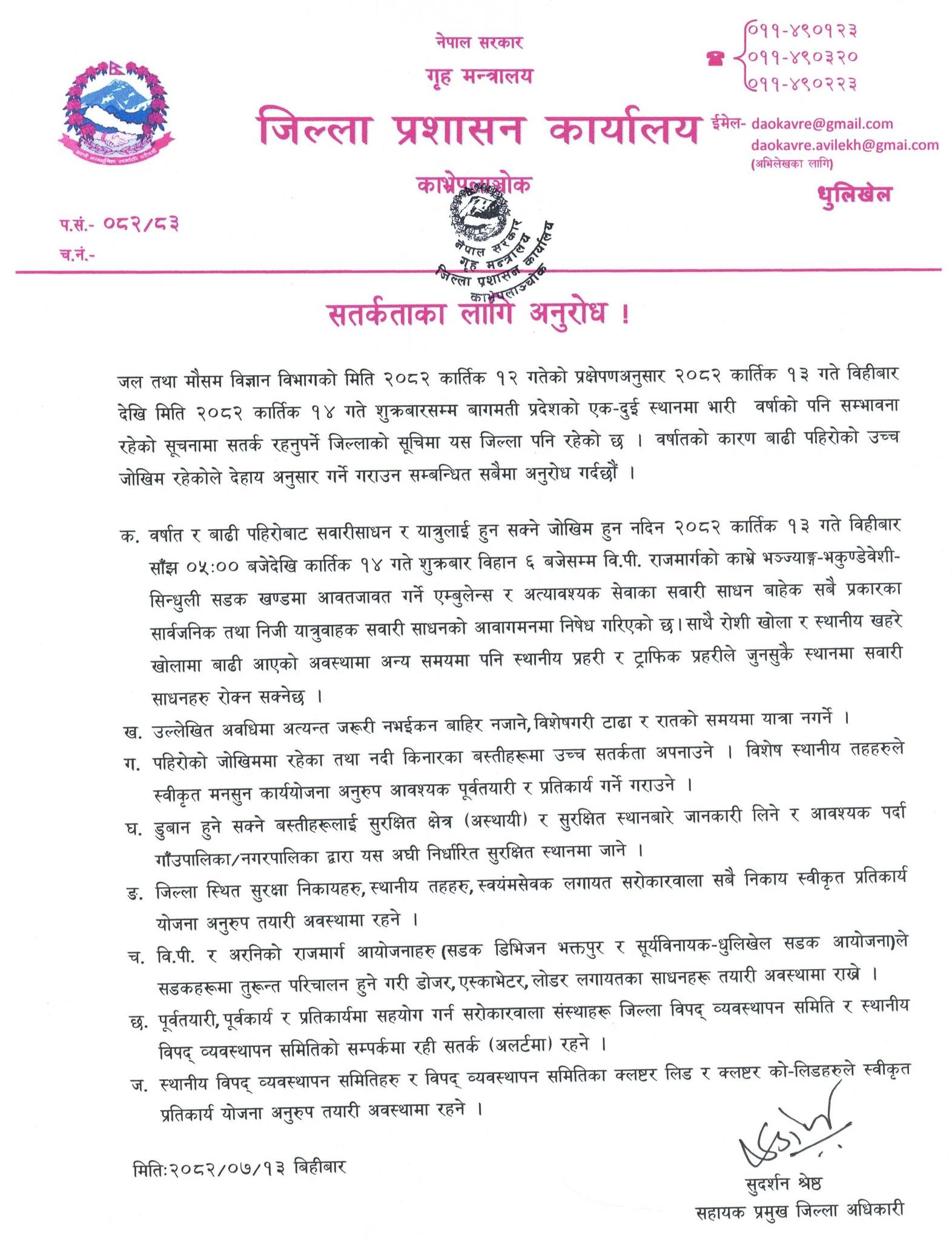 त्यसैगरी, काभ्रे जिल्ला प्रशासन कार्यालयले विपी राजमार्गमा आज, कार्तिक १३ गते बिहीबार साँझ ५ बजे देखि भोलि कार्तिक १४ गते बिहान ६ बजे सम्म एम्बुलेन्स र अत्यावश्यक सेवा बाहेक सबै सार्वजनिक तथा निजी यात्रुबाहक सवारी साधनको आवागमनमा रोक लगाएको छ।