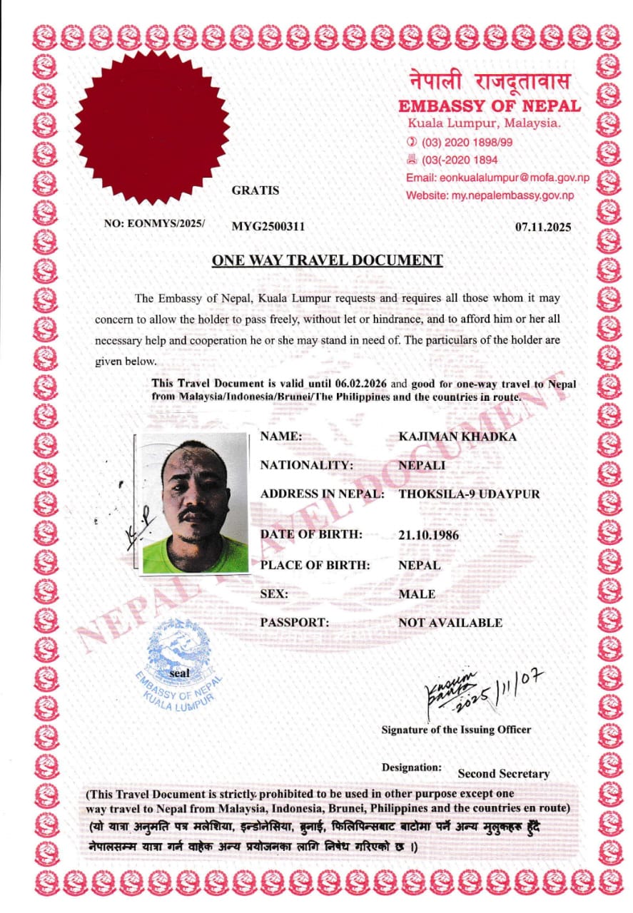 काठमाडौंँ। परदेशमा बितेका वर्षहरू, अनिश्चितता, एक्लोपन र घर फर्किने अधुरो सपना—यी सबै बोकेर हिँडेका उदयपुर ठोक्सिला–०९ का काजीमान खड्का अन्ततः आफ्नै देशको भूमिमा उत्रिन सफल भएका छन्। मलेसियामा कागजातविहीन मुद्दामा पक्राउ परी जेल सजाय भोगिसकेका काजीमानको पीडा सजायपछि पनि सकिएको थिएन। परिवारको आर्थिक अवस्था कमजोर हुँदा एकतर्फी हवाई टिकट जुटाउन नसक्ने र त्यसकै कारण घरफिर्ती केन्द्रमै महिनौँदेखि रोकिइरहनुपर्ने बाध्यता थियो।