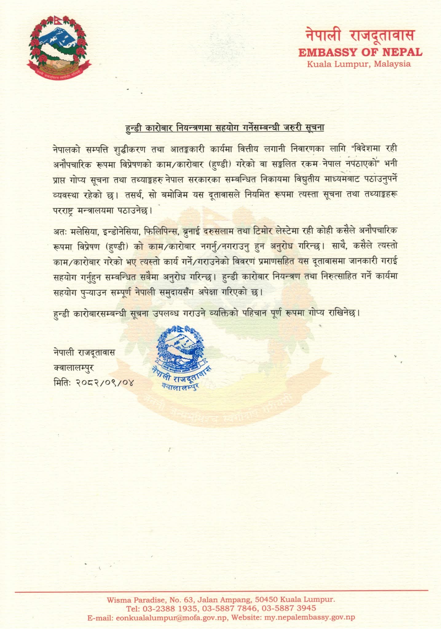 क्वालालम्पुर । मलेसियास्थित नेपाली राजदूतावासले हुन्डी कारोबार नियन्त्रण तथा निरुत्साहित गर्न सबै नेपाली समुदायलाई लक्षित गर्दै जरुरी सूचना जारी गरेको छ। दूतावासले विदेशमा रही अनौपचारिक रूपमा विप्रेषण (हुण्डी) गर्ने, वा सङ्कलित रकम नेपाल नपठाउने कार्यले सम्पत्ति शुद्धीकरण तथा आतङ्ककारी गतिविधिमा वित्तीय लगानी बढ्ने जोखिम रहेको उल्लेख गरेको छ।