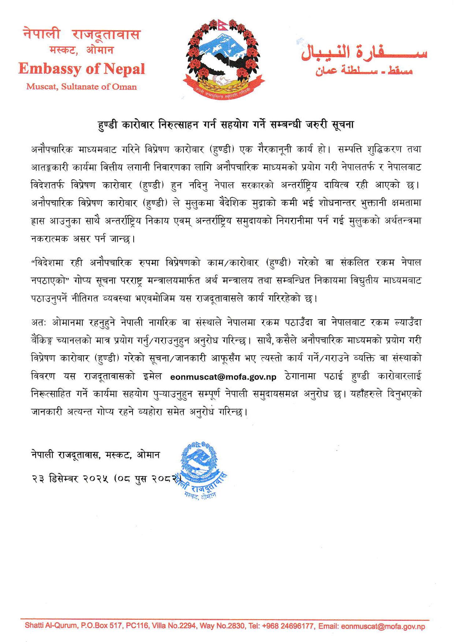 यसै सन्दर्भमा, ओमानमा रहनुहुने नेपाली नागरिक तथा संस्थालाई नेपालमा रकम पठाउँदा वा नेपालबाट रकम ल्याउँदा अनिवार्य रूपमा बैंकिङ च्यानलको मात्र प्रयोग गर्न अनुरोध गरिएको छ। साथै, कसैले अनौपचारिक माध्यम प्रयोग गरी हुण्डी कारोबार गरेको सूचना वा जानकारी भएमा सम्बन्धित व्यक्ति वा संस्थाको विवरण राजदूतावासको इमेल eonmuscat@mofa.gov.np मा पठाई हुण्डी कारोबार निरुत्साहित गर्ने अभियानमा सहयोग गर्न आग्रह गरिएको छ।