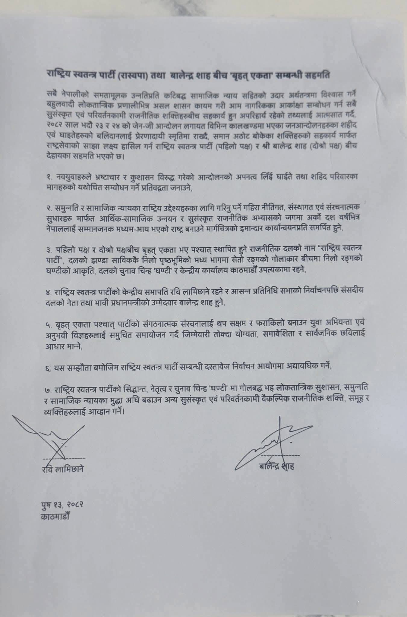 ४. राष्ट्रिय स्वतन्त्र पार्टीको केन्द्रीय सभापति रवि लामिछाने रहने र आसन्न प्रतिनिधि सभाको निर्वाचनपछि संसदीय दलको नेता तथा भावी प्रधानमन्त्रीको उम्मेदवार बालेन्द्र शाह हुने,