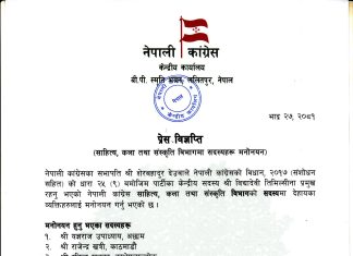 कांग्रेसको विधान, २०१७ (संशोधन सहित)को धारा २५ (९) बमोजिम देउवाले पार्टीका केन्द्रीय सदस्य विद्यादेवी तिमिल्सीना प्रमुख...