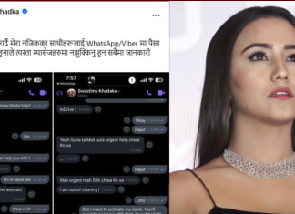 काठमाडौं । नायिका स्वस्तिमा खड्काले आफ्नो नामको दुरुपयोग गर्दै सामाजिक सञ्जालमार्फत ठगीको प्रयास भइरहेको भन्दै सबैलाई सतर्क रहन आग्रह गरेकी छन् । खड्काले सामाजिक सञ्जालमा जानकारी दिँदै आफू नजिकका साथीहरूलाई भाइबर र व्हाट्सएपमार्फत पैसा...