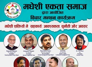 मधेशी एकता समाजले आज ‘मधेशी शक्तियौंमें सहकार्यः आवश्यकता, चुनौती और अवसर’ विषयक विचार मन्थन कार्यक्रम गरेर बिभिन्न पार्टीमा...