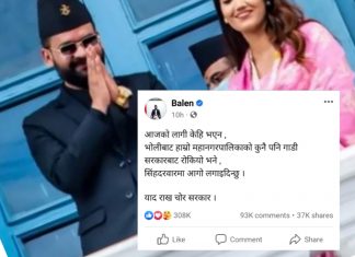 काठमाडौं । काठमाडौं महानगरपालिकाका मेयर बालेन शाह पत्नी चढेको गाडी ट्राफिक प्रहरीले रोकेपछि उनले सिंहदरबार जलाउने धम्की दिएका छन्।
