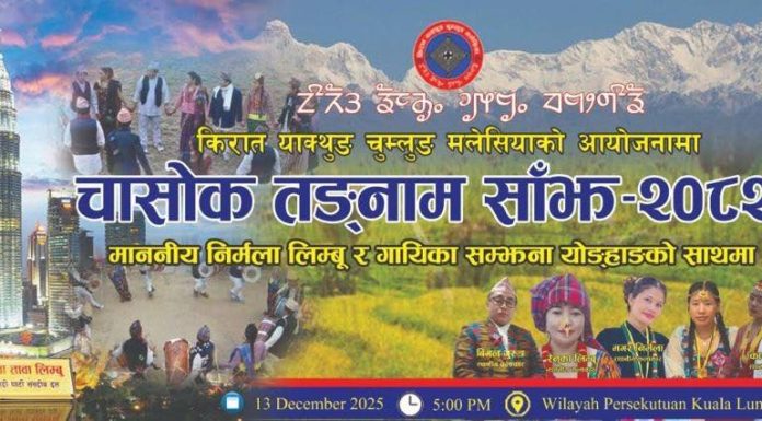 मलेसिया । किरात याक्थुङ चुम्लुङ मलेसियाले आगामी चासोक तङ्नाम साँस्कृतिक साँभा–२०२५ भव्य रूपमा आयोजना गर्ने भएको छ। कार्यक्रम १३ डिसेम्बर २०२५, शुक्रबारका दिन Wilayah Persekutuan Kuala Lumpur मा साँझ ५ बजे सुरु हुने आयोजकले जनाएको छ।