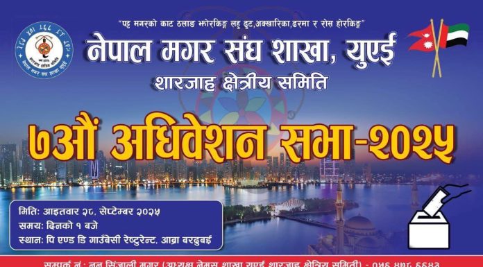 शारजाह, २८ सेप्टेम्बर २०२५ ।नेपाल मगर संघ शाखा युएई शारजाह क्षेत्रीय समितिको ७औं अधिवेशन आगामी २८ सेप्टेम्बर २०२५ आइतबारका दिन सम्पन्न हुने भएको छ।