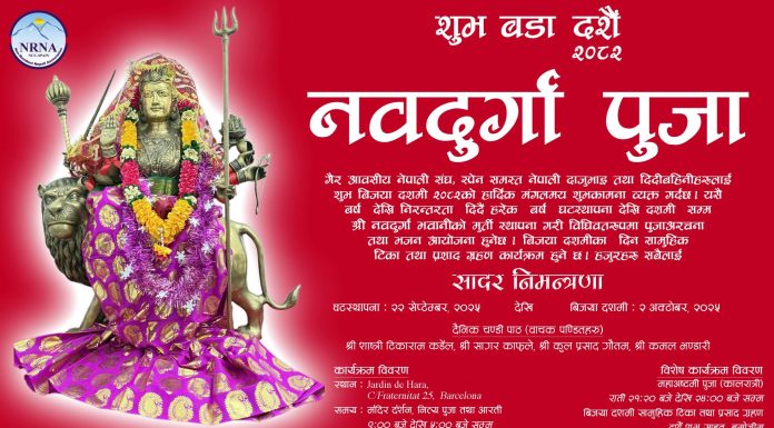 बार्सिलोना, बार्सिलोनाको ग्रासियास्थित Jardin de Hara मा यस वर्ष गैर आवासीय नेपाली संघ (NRNA) स्पेन परिवारले भव्य दुर्गा पूजा आयोजना गर्ने भएको छ।