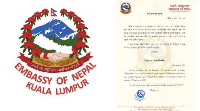 मलेसियास्थित नेपाली राजदूतावासले एक सूचना जारी गर्दै २०७२ सालको संविधान दिवस तथा राष्ट्रिय दिवसको अवसरमा सेप्टेम्बर १९, २०२५ असोज ३ गते शुक्रबारका दिन दुतवासबाट सुचना जारी गर्दै कार्यालय बन्द रहने जानकारी गराएको छ ।