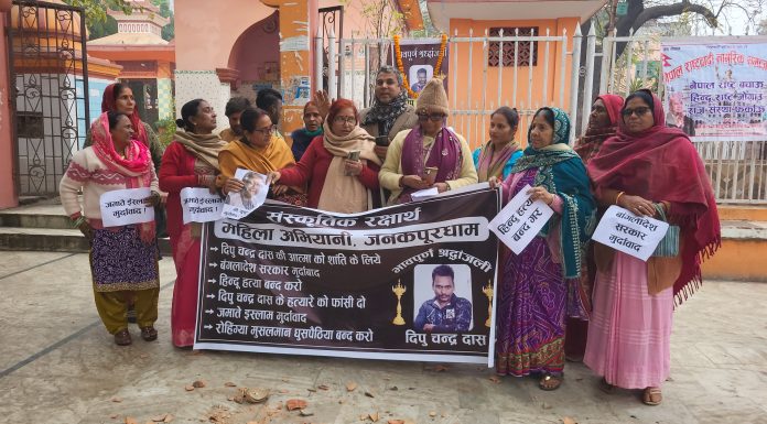 बांगलादेशमा केही दिनअघि निर्ममतापूर्वक हिन्दू समुदायका युवा दिपु दासको हत्या गरिएको विरोधमा शुक्रबार जनकपुरधामको जनक चोकमा महिला अभियानीहरुले विरोध प्रदर्शन गरेका छन् ।