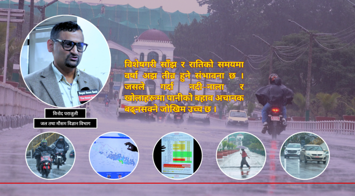 जल तथा मौसम विज्ञान विभागका प्रमुख बाढी पूर्वानुमान महाशाखाका वरिष्ठ हाइड्रोलोजिस्ट विनोद पराजुलीका अनुसार हाल बागमती, मधेस, गण्डकी र कोशी प्रदेशका विभिन्न भागमा मध्यमदेखि भारी वर्षा भइरहेको छ ।