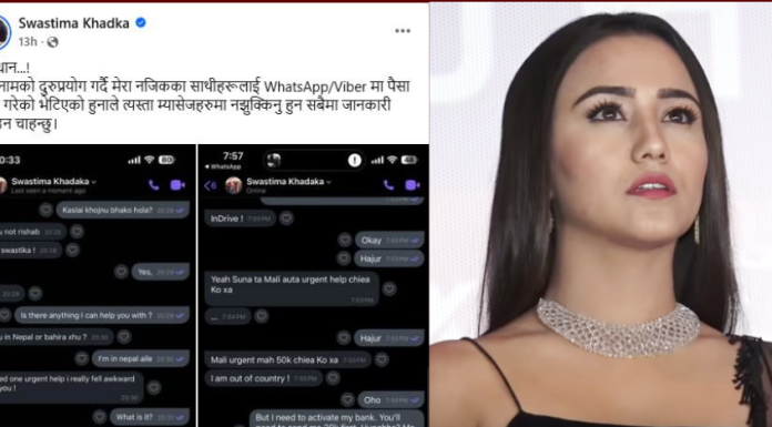 काठमाडौं । नायिका स्वस्तिमा खड्काले आफ्नो नामको दुरुपयोग गर्दै सामाजिक सञ्जालमार्फत ठगीको प्रयास भइरहेको भन्दै सबैलाई सतर्क रहन आग्रह गरेकी छन् । खड्काले सामाजिक सञ्जालमा जानकारी दिँदै आफू नजिकका साथीहरूलाई भाइबर र व्हाट्सएपमार्फत पैसा मागिएको जानकारी पाएकी बताएकी छन् ।