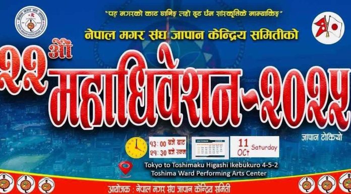 टोकियो, जापान । नेपाल मगर संघ जापान केन्द्रीय समितिको २२ औं महाधिवेशन आगामी ११ अक्टोबर २०२५, शनिबार दिउँसो १:०० बजे हुने जानकारी फेरि एकपटक सहर्ष गराइएको छ। संघले यो महत्वपूर्ण अधिवेशनलाई व्यवस्थित र समावेशी बनाउन आवश्यक तयारीहरू अघि बढाएको छ।