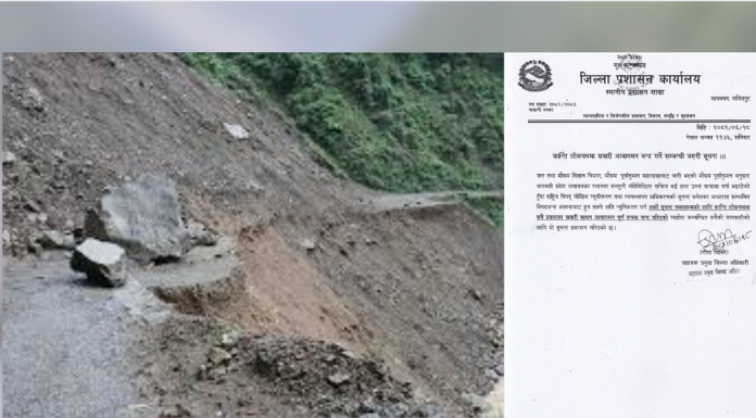 काठमाडौं । हाल देशभर विशेषगरी बागमती प्रदेशमा मनसुन सक्रिय भई उच्च मात्रामा वर्षा भइरहेको सन्दर्भमा सम्भावित विपद् जोखिम न्यूनीकरण गर्न कान्ति लोकपथमा सवारी आवागमन पूर्णरूपमा बन्द गरिएको छ ।